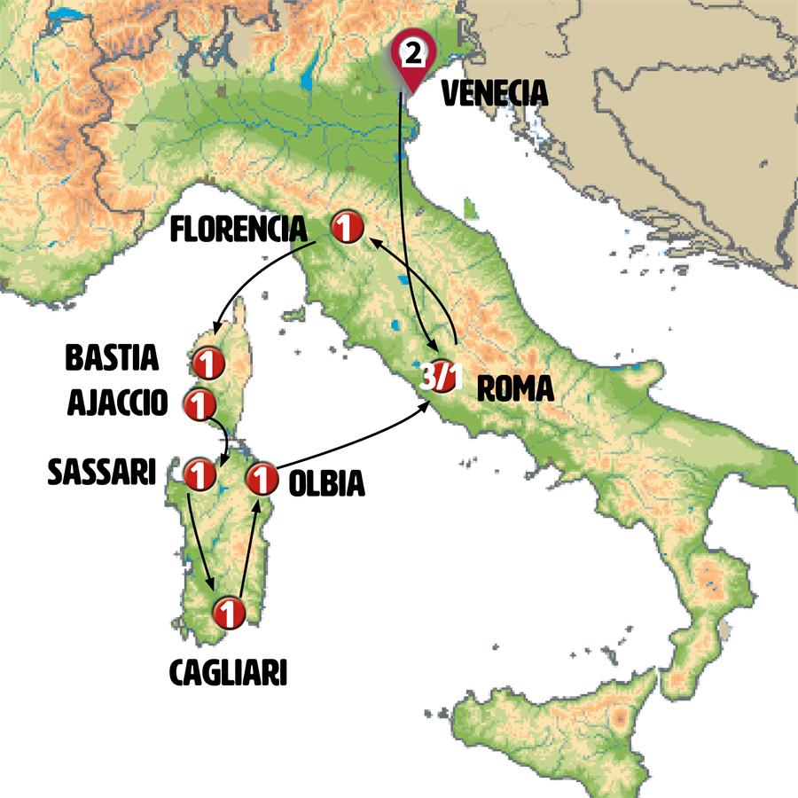 VENECIA, RAVENA, ASÍS, ROMA, FLORENCIA, LIVORNO, BASTIA, CORTE, AJACCIO, BONIFACIO, PALAU, LA MADDALENA, SASSARI, ALGUER, BOSA, CAGLIARI, NURAGHE LOSA, OLBIA, FERRI CAGLIARI - CIVITAVECCHIA