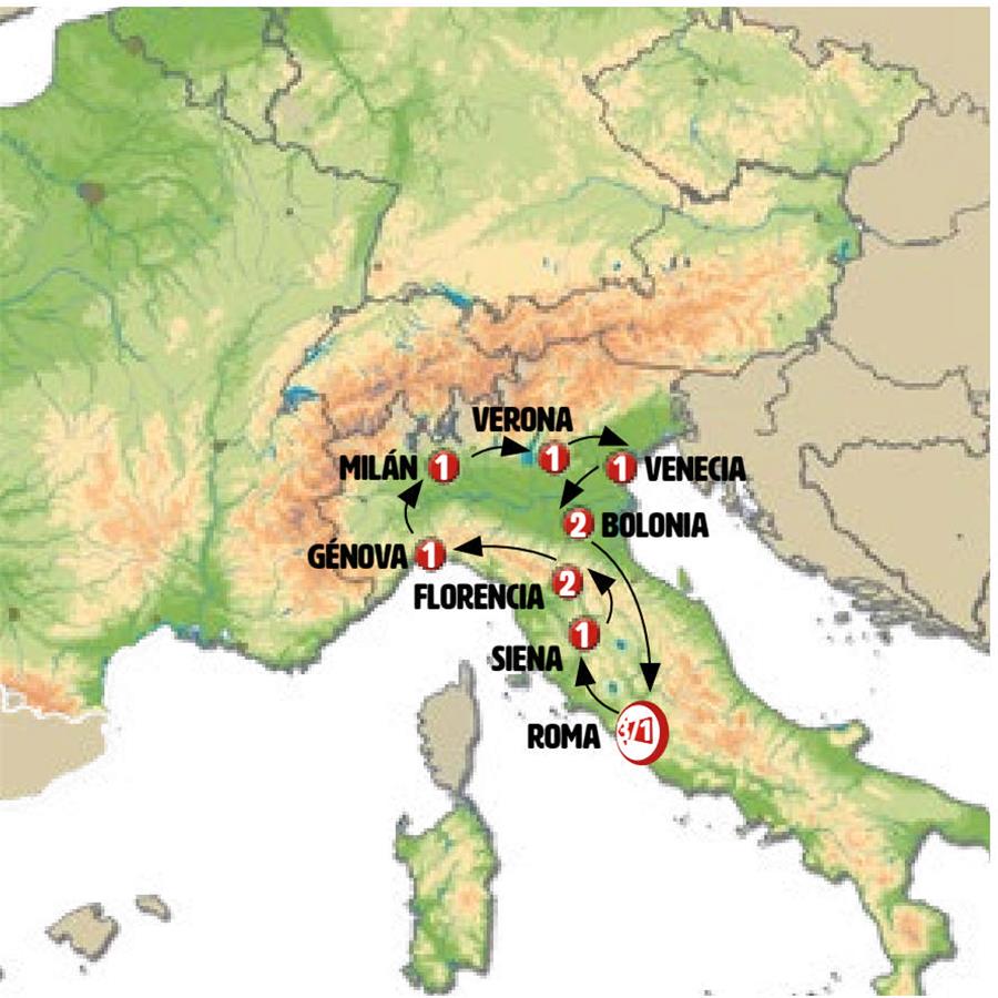 ROMA, ORVIETO, CASTIGLIONE DEL LAGO, SIENA, MONTERIGGIONI, SAN GIMIGNANO, FLORENCIA, PISA, CINQUE TERRE, GÉNOVA, PORTOFINO, MILÁN, REGIÓN DE LOS LAGOS, VERONA, VENECIA, FERRARA, MÓDENA, BOLONIA