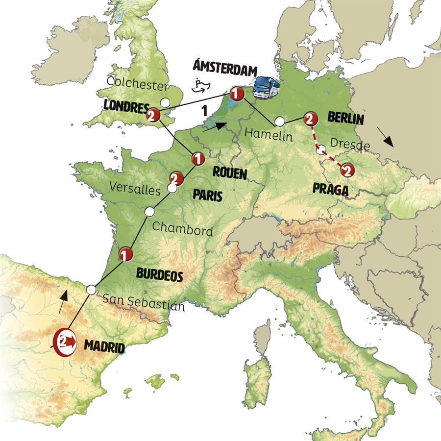Disfruta de un recorrido grupal en autobús con guía en español durante 13 días, visitando 15 ciudades. Incluye alojamiento en hoteles y desayunos diarios. Turismo guiado por MADRID, SAN SEBASTIÁN, BURDEOS, CHAMBORD, PARÍS, ROUEN, CANAL DE LA MANCHA, CANTERBURY, LONDRES, COLCHESTER, FERRI COLCHESTER - VOLENDAM, VOLENDAM, ÁMSTERDAM, HAMELIN, BERLÍN.