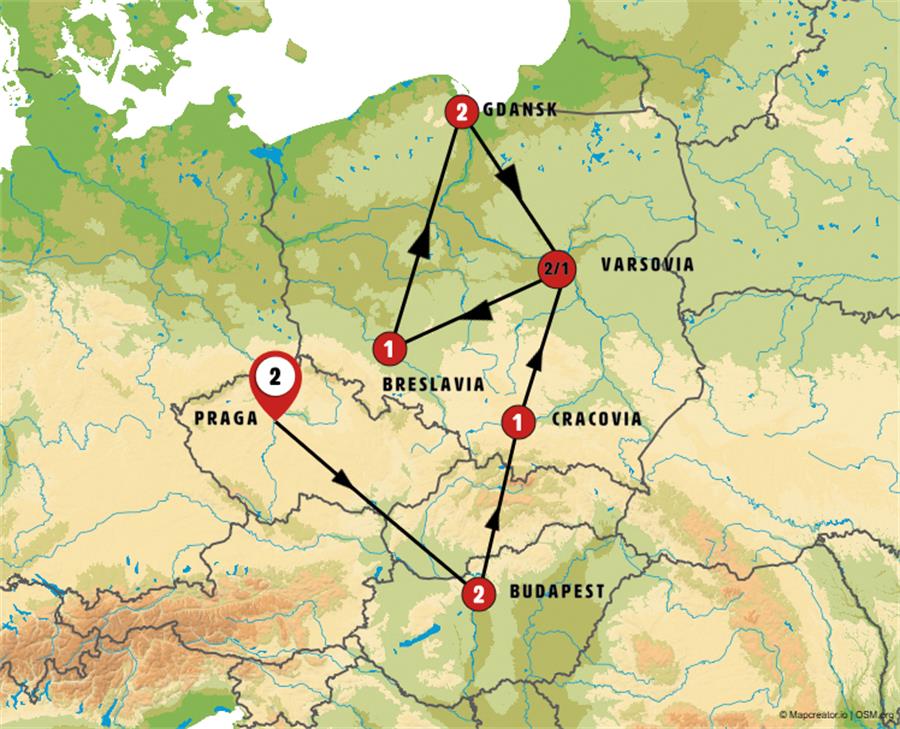 PRAGA, LEDNICE, BUDAPEST, BRATISLAVA, TRENCIN, CRACOVIA, AUSCHWITZ, CZESTOCHOWA, VARSOVIA, WROCLAW, POZNAN, TORUN, GDANSK, MALBORK, FROMBORK, ELBLAG