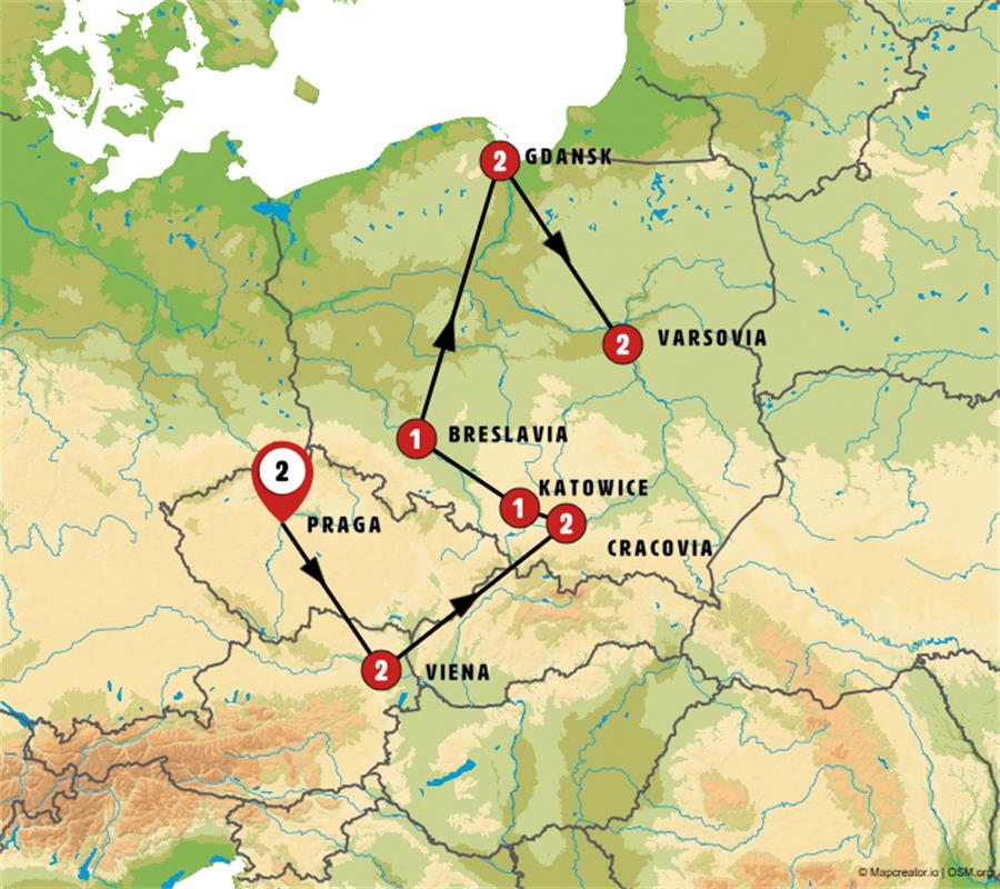 PRAGA, CESKÉ BUDEJOVICE, CESKY KRUMLOV, VIENA, BRATISLAVA, TRENCIN, CRACOVIA, KALWARIA ZEBRZYDOWSKA, BARWALD DOLNY, WADOWICE, AUSCHWITZ, KATOWICE, OPOLE, WROCLAW, POZNAN, TORUN, GDANSK, MALBORK, FROMBORK, ELBLAG, VARSOVIA