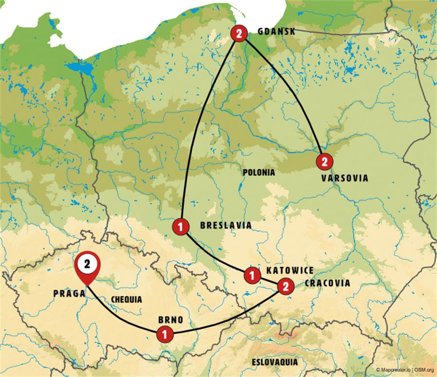 PRAGA, BRNO, BRATISLAVA, TRENCIN, CRACOVIA, KALWARIA ZEBRZYDOWSKA, BARWALD DOLNY, WADOWICE, AUSCHWITZ, KATOWICE, OPOLE, WROCLAW, POZNAN, TORUN, GDANSK, MALBORK, FROMBORK, ELBLAG, VARSOVIA