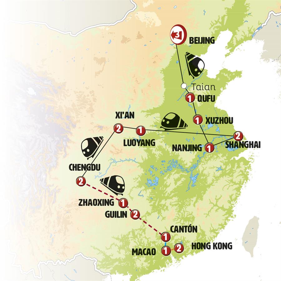 Disfruta de un recorrido grupal en autobús con guía en español durante 14 días, visitando 13 ciudades. Incluye alojamiento en hoteles y desayunos diarios. Turismo guiado por PEKÍN, TAIAN, QUFU, XUZHOU, NANKÍN, SUZHOU, TONGLI, SHANGHÁI, LUOYANG, LONGMEN, SANMENXIA, XIAN, CHENGDU.
