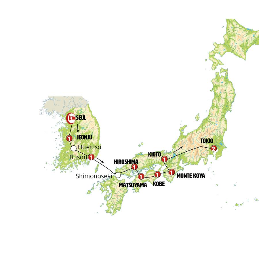 Disfruta de un recorrido grupal en autobús con guía en español durante 14 días, visitando 19 ciudades. Incluye alojamiento en hoteles y desayunos diarios. Turismo guiado por SEÚL, SUWON, JEONJU, DAMYANG, HAEINSA, BUSAN, FUKUOKA, IWAKUNI, ITSUKUSHIMA, HIROSHIMA, MATSUYAMA, KOTOHIRA, TAKAMATSU, NARUTO, KOBE, OSAKA, MONTE KOYA, KIOTO, TOKIO.