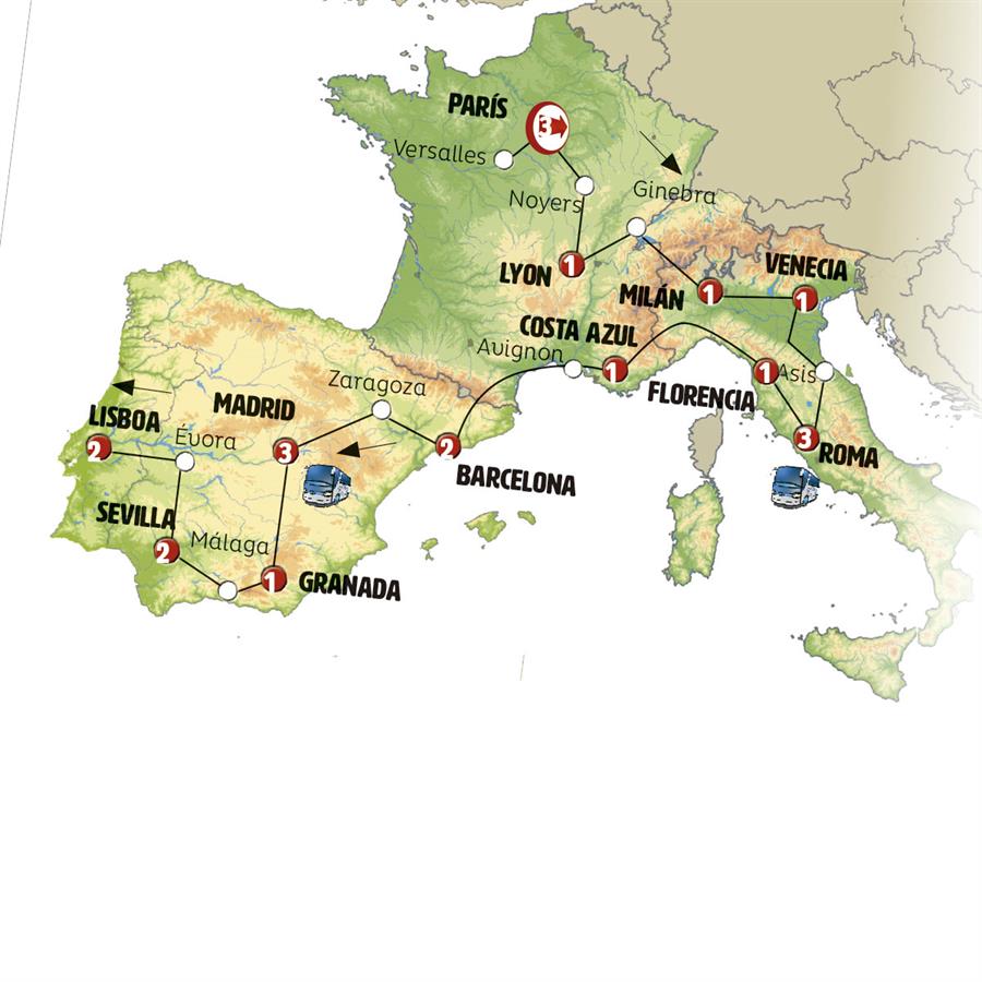 Disfruta de un recorrido grupal en autobús con guía en español durante 22 días, visitando 28 ciudades. Incluye alojamiento en hoteles y desayunos diarios. Turismo guiado por PARÍS, BORGOÑA, BEAUNE, LYON, GINEBRA, MILÁN, VENECIA, RAVENA, ASÍS, ROMA, FLORENCIA, PISA, SESTRI LEVANTE, MONTECARLO, COSTA AZUL, ARLES, BARCELONA, PENEDÉS, ZARAGOZA, MADRID, GRANADA, NERJA, MÁLAGA, RONDA, SEVILLA, MÉRIDA, ÉVORA, LISBOA.