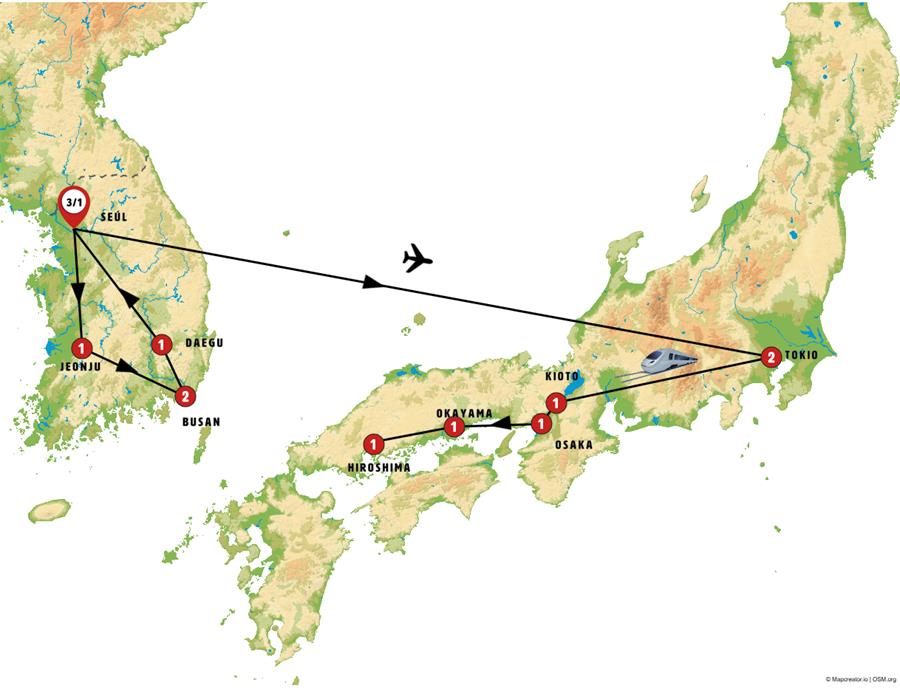 Disfruta de un recorrido grupal en autobús con guía en español durante 15 días, visitando 22 ciudades. Incluye alojamiento en hoteles y desayunos diarios. Turismo guiado por SEÚL, SUWON, JEONJU, DAMYANG, HAEINSA, BUSAN, SEOKGURAM, BULGUKSA, GYEONGJU, DAEGU, ANDONG, HAHOE, TOKIO, KIOTO, NARA, OSAKA, HIMEJI, JARDINES DE KORAKUEN, OKAYAMA, KURASHIKI, ITSUKUSHIMA, HIROSHIMA.