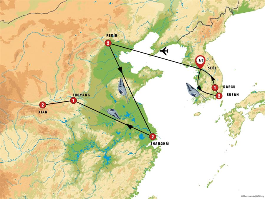 SEÚL, BUSAN, SEOKGURAM, BULGUKSA, GYEONGJU, DAEGU, ANDONG, HAHOE, PEKÍN, SHANGHÁI, LUOYANG, LONGMEN, SANMENXIA, XIAN