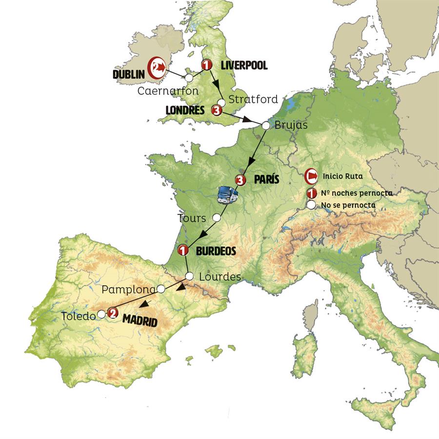 DUBLÍN, CAERNARFON, LIVERPOOL, STRATFORD, OXFORD, LONDRES, CALAIS, AMIENS, PARÍS, BLOIS, TOURS, BURDEOS, SAN SEBASTIÁN, ÁREA DE SERVICIO FORONDA, MADRID