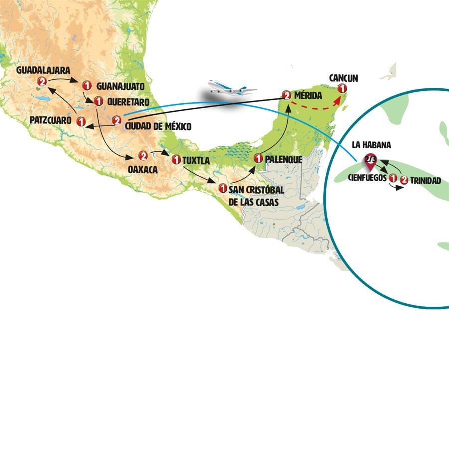 Disfruta de un recorrido grupal en autobús con guía en español durante 23 días, visitando 37 ciudades. Incluye alojamiento en hoteles y desayunos diarios. Turismo guiado por LA HABANA, GUAMÁ, PUNTA PERDIZ, GIRÓN, CIENFUEGOS, TRINIDAD, CIUDAD DE MÉXICO, MINA DE LAS DOS ESTRELLAS, TLALPUJAHUA, PÁTZCUARO, MORELIA, TLAQUEPAQUE, GUADALAJARA, GUANAJUATO, DOLORES HIDALGO, SAN MIGUEL DE ALLENDE, QUERÉTARO, TULA, PUEBLA, OAXACA, SAN PABLO VILLA DE MITLA, TUXTLA GUTIÉRREZ, CAÑÓN DEL SUMIDERO, CHIAPA DE CORZO, ZINACANTÁN, SAN JUAN DE CHAMULA, SAN CRISTÓBAL DE LAS CASAS, AGUA AZUL, MISOL HA, PALENQUE, CAMPECHE, MÉRIDA, IZAMAL, CHICHÉN ITZÁ, RÍO LAGARTOS, CENOTE CHOJ HA, CANCÚN.