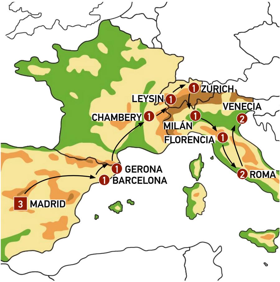 Disfruta de un recorrido grupal en autobús con guía en español durante 14 días, visitando 23 ciudades. Incluye alojamiento en hoteles y desayunos diarios. Turismo guiado por MADRID, ZARAGOZA, POBLET, BARCELONA, GERONA, CARRIÈRES DE LUMIÈRES, CHAMBERY, GINEBRA, GRUYERES, LEYSIN, INTERLAKEN, LUCERNA, ZÚRICH, BELLINZONA, COMO, MILÁN, GÉNOVA, PISA, FLORENCIA, ROMA, BOLONIA, FERRARA, VENECIA.