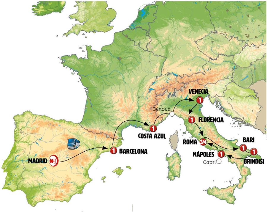 MADRID, ZARAGOZA, BARCELONA, COSTA AZUL, MÓNACO, GÉNOVA, VENECIA, FLORENCIA, ROMA, ABADIA SAN GIOVANNI IN VENERE, TÉRMOLI, BARI, BRÍNDISI, LECCE, GALLIPOLI, ALBEROBELLO, MATERA, NÁPOLES, CAPRI, POMPEYA