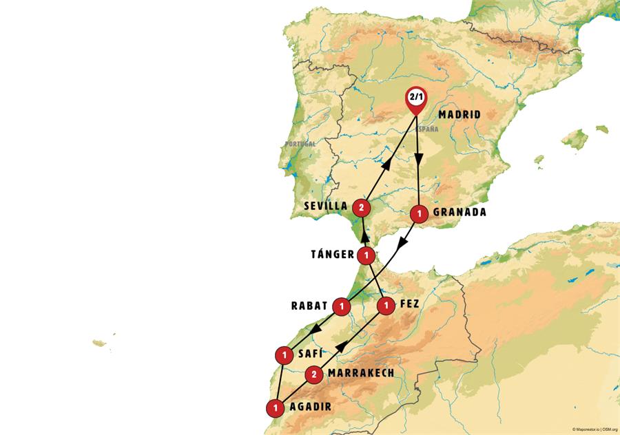 Disfruta de un recorrido grupal en autobús con guía en español durante 14 días, visitando 16 ciudades. Incluye alojamiento en hoteles y desayunos diarios. Turismo guiado por MADRID, GRANADA, TÁNGER, ARCILA, RABAT, CASABLANCA, EL YADIDA, SAFÍ, ESAUIRA, AGADIR, MARRAKECH, OUZOUD, FEZ, SEVILLA, CÓRDOBA, CONSUEGRA.