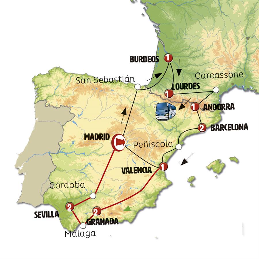 Disfruta de un recorrido grupal en autobús con guía en español durante 12 días, visitando 20 ciudades. Incluye alojamiento en hoteles y desayunos diarios. Turismo guiado por MADRID, SAN SEBASTIÁN, BURDEOS, LOURDES, CARCASONA, FOIX, ANDORRA, MONTSERRAT, BARCELONA, PEÑÍSCOLA, VALENCIA, ALICANTE, GUADIX, GRANADA, NERJA, MÁLAGA, RONDA, SEVILLA, CÓRDOBA, CONSUEGRA.