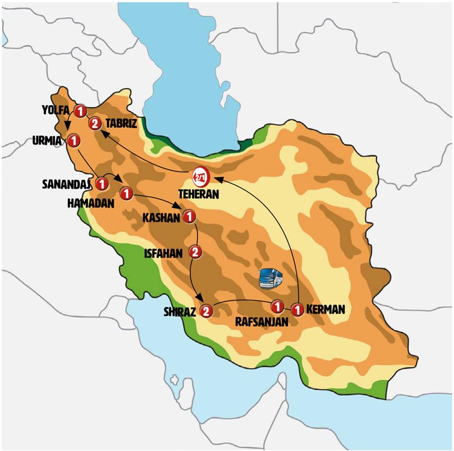 Disfruta de un recorrido grupal en autobús con guía en español durante 16 días, visitando 21 ciudades. Incluye alojamiento en hoteles y desayunos diarios. Turismo guiado por TEHERÁN, TABRIZ, YOLFA, KHOY, URMIA, TEPPE HASANLU, CUEVA SHAOLAN, SANANDAJ, HAMADÁN, QOM, KASHAN, CIUDAD SUBTERRÁNEA DE NUSHABAD, CARAVANASERAIL ABOUZEID, ABYANEH, ISFAHÁN, IZADKHAST, QALAT, SHIRAZ, RAFSANJAN, MAHAN, KERMÁN.