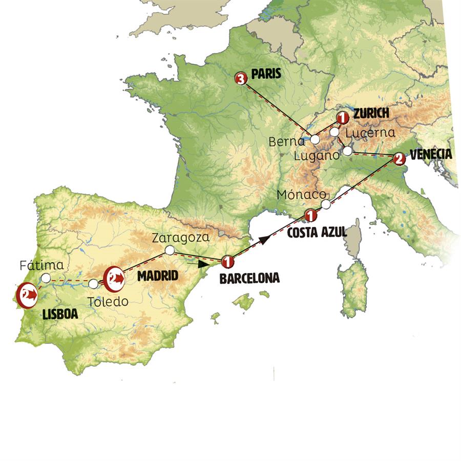 PORTUGALESPAÑAFRANCIAMONACOITALIASUIZAPaquete grupal por 13 días