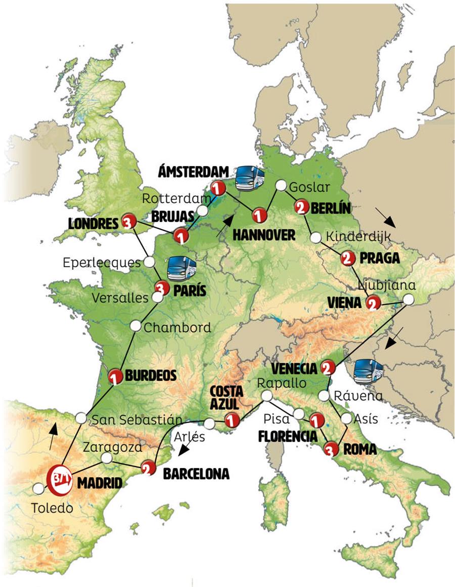 Disfruta de un recorrido grupal en autobús con guía en español durante 30 días, visitando 36 ciudades. Incluye alojamiento en hoteles y desayunos diarios. Turismo guiado por MADRID, SAN SEBASTIÁN, BURDEOS, CHAMBORD, PARÍS, CANTERBURY, LONDRES, CANAL DE LA MANCHA, BRUJAS, GANTE, MIDDELBURG, ROTTERDAM, ÁMSTERDAM, HANNOVER, GOSLAR, BERLÍN, DRESDE, PRAGA, CESKÉ BUDEJOVICE, CESKY KRUMLOV, VIENA, MARIBOR, LIUBLIANA, VENECIA, RAVENA, ASÍS, ROMA, FLORENCIA, PISA, SESTRI LEVANTE, MONTECARLO, COSTA AZUL, ARLES, BARCELONA, PENEDÉS, ZARAGOZA.