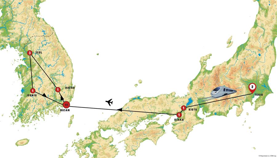 TOKIO, KIOTO, NARA, OSAKA, BUSAN, SEOKGURAM, BULGUKSA, GYEONGJU, DAEGU, ANDONG, HAHOE, SEÚL, SUWON, JEONJU, DAMYANG, HAEINSA
