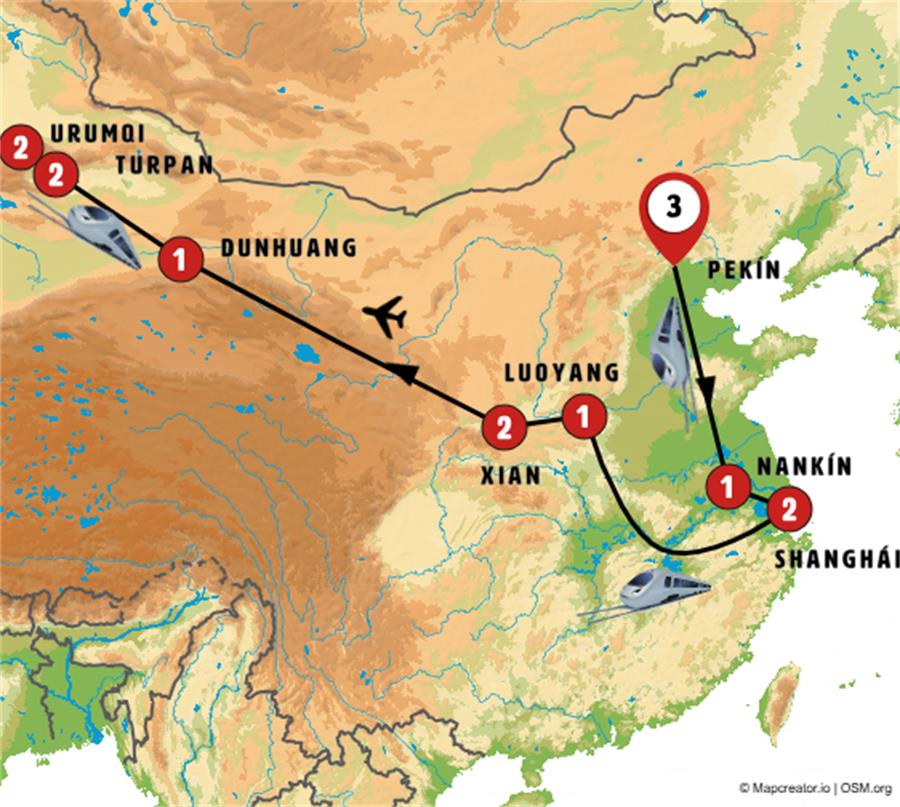 Disfruta de un recorrido grupal en autobús con guía en español durante 15 días, visitando 12 ciudades. Incluye alojamiento en hoteles y desayunos diarios. Turismo guiado por PEKÍN, NANKÍN, SUZHOU, TONGLI, SHANGHÁI, LUOYANG, LONGMEN, SANMENXIA, XIAN, DUNHUANG, TURPAN, URUMQI.