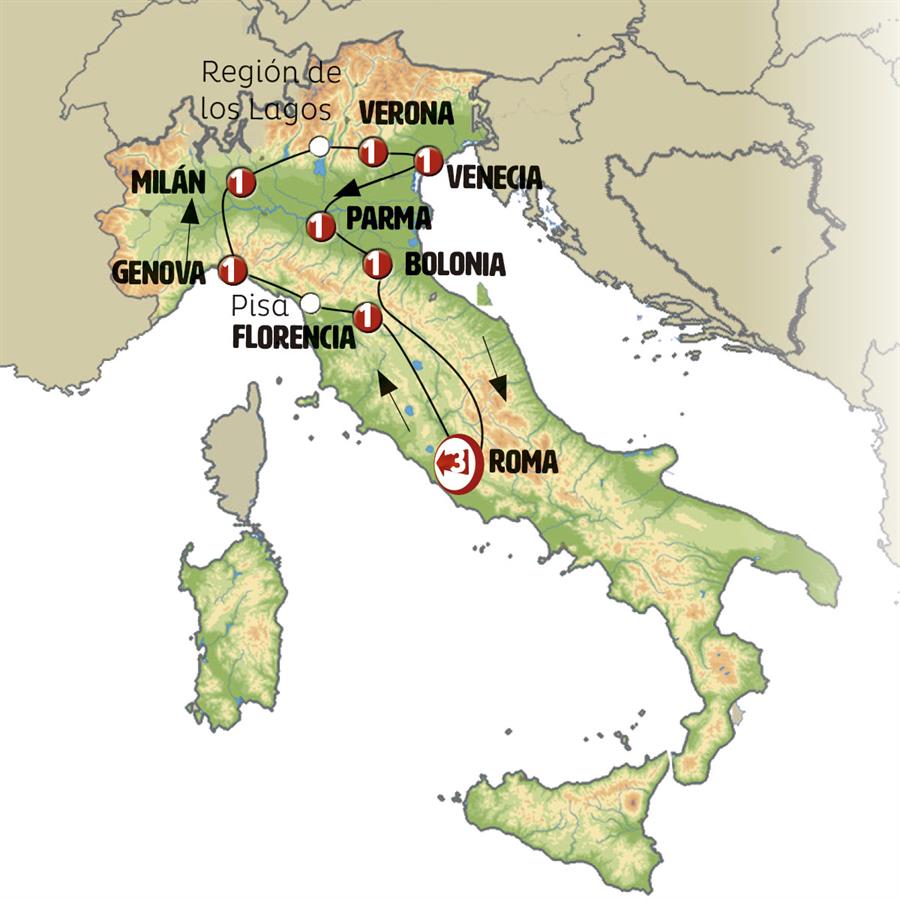 ROMA, FLORENCIA, PISA, CINQUE TERRE, GÉNOVA, PORTOFINO, MILÁN, REGIÓN DE LOS LAGOS, VERONA, VENECIA, FERRARA, MÓDENA, BOLONIA
