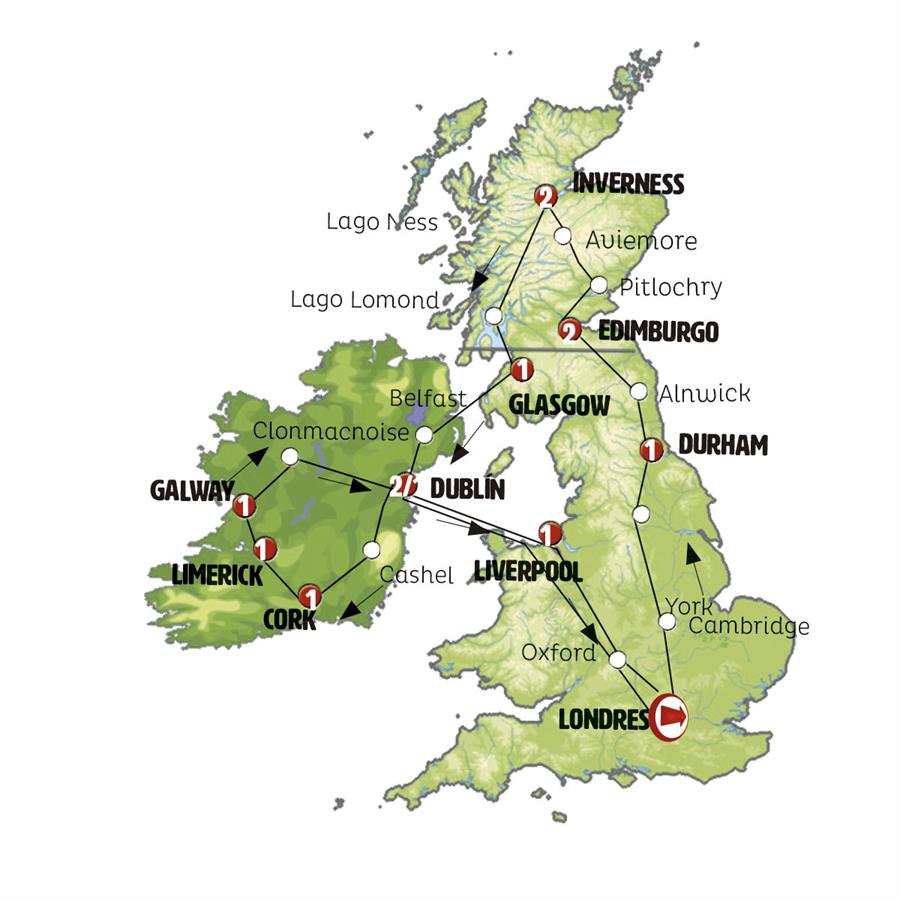 LONDRES, CAMBRIDGE, YORK, DURHAM, ALNWICK, EDIMBURGO, LOS KELPIES, STIRLING, PITLOCHRY, CULLODEN, INVERNESS, FORT WILLIAM, INVERARAY, LAGO LOMOND, GLASGOW, BELFAST, DUBLÍN, POWERSCOURT, KILKENNY, CASHEL, CORK, KINSALE, KILLARNEY, LIMERICK, ACANTILADOS DE MOHER, GALWAY, CLONMACNOISE, CAERNARFON, LIVERPOOL, STRATFORD, OXFORD