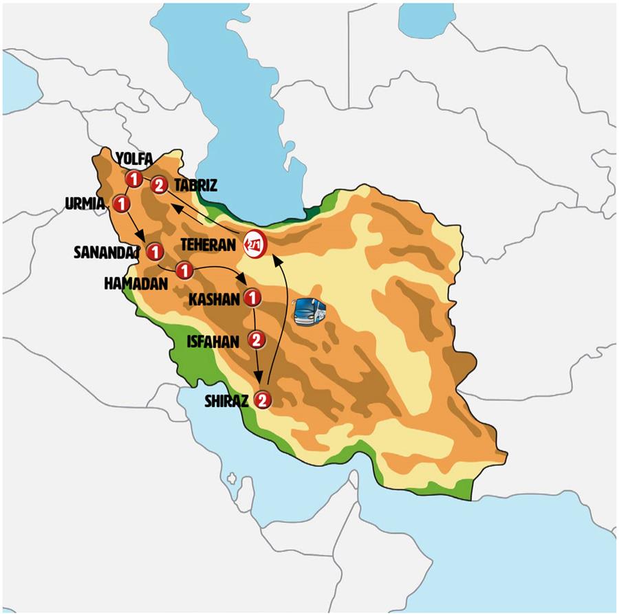 Disfruta de un recorrido grupal en autobús con guía en español durante 14 días, visitando 18 ciudades. Incluye alojamiento en hoteles y desayunos diarios. Turismo guiado por TEHERÁN, TABRIZ, YOLFA, KHOY, URMIA, TEPPE HASANLU, CUEVA SHAOLAN, SANANDAJ, HAMADÁN, QOM, KASHAN, CIUDAD SUBTERRÁNEA DE NUSHABAD, CARAVANASERAIL ABOUZEID, ABYANEH, ISFAHÁN, IZADKHAST, QALAT, SHIRAZ.