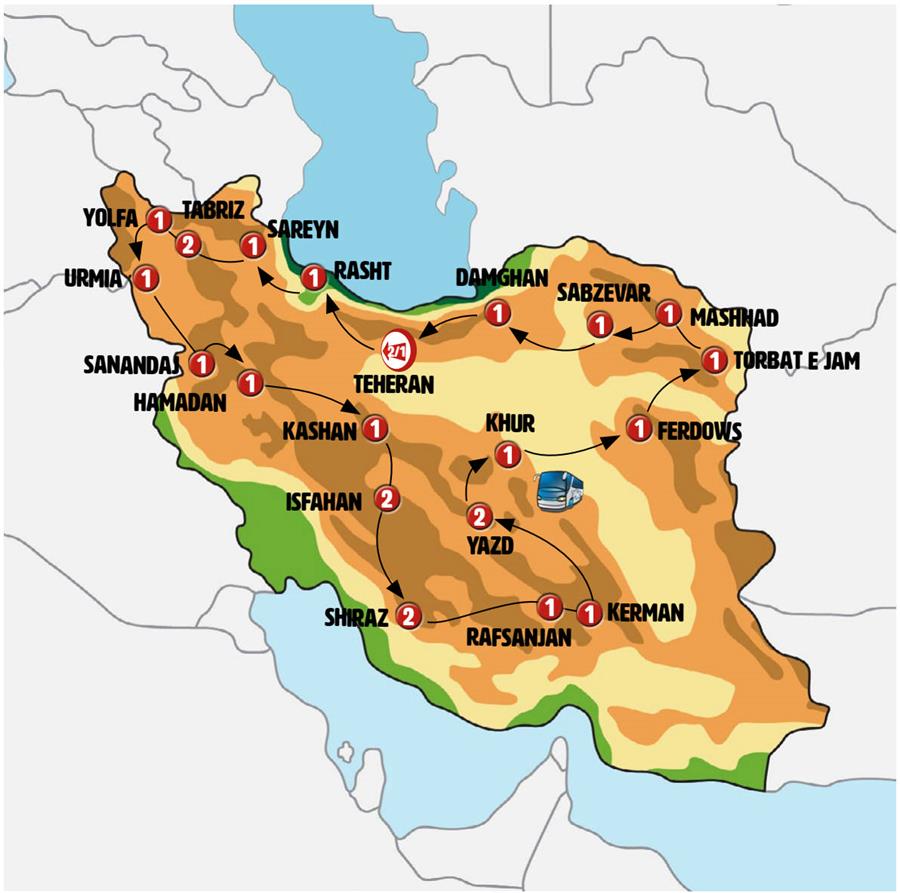 Disfruta de un recorrido grupal en autobús con guía en español durante 27 días, visitando 48 ciudades. Incluye alojamiento en hoteles y desayunos diarios. Turismo guiado por TEHERÁN, QAZVIN, RASHT, BANDAR ANZALI, PUENTE DE CRISTAL, SAREYN, ARDEBIL, TABRIZ, YOLFA, KHOY, URMIA, TEPPE HASANLU, CUEVA SHAOLAN, SANANDAJ, HAMADÁN, QOM, KASHAN, CIUDAD SUBTERRÁNEA DE NUSHABAD, CARAVANASERAIL ABOUZEID, ABYANEH, ISFAHÁN, IZADKHAST, QALAT, SHIRAZ, PASARGADA, MEYMAND, RAFSANJAN, MAHAN, KERMÁN, ZEIN-O-DIN CARAVANSERAI, SARYAZD, YAZD, CHAK CHAK, KHARANG, GARMEH, KHUR, TABAS, ESFAHAK, FERDOWS, GONABAD, TORBAT-E JAM, MASHHAD, NISHAPUR, ZAFARANIYEH, SABZEVAR, JANGALE ABR, DAMGHAN, GARMSAR.
