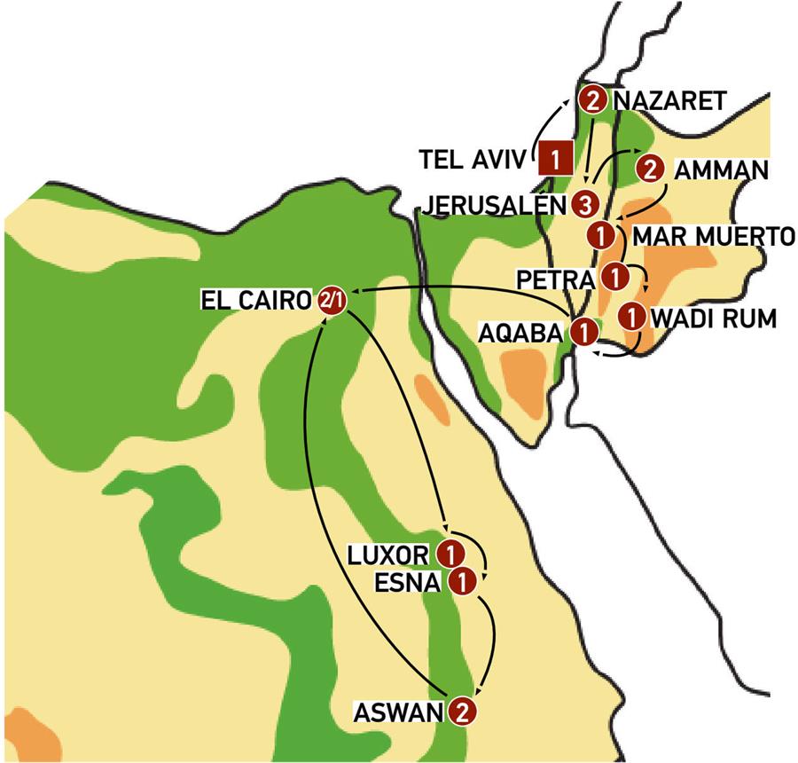 Disfruta de un recorrido grupal en autobús con guía en español durante 20 días, visitando 26 ciudades. Incluye alojamiento en hoteles y desayunos diarios. Turismo guiado por TEL AVIV, CESAREA, HAIFA, SAN JUAN DE ACRE, NAZARET, MONTE DEL PRECIPICIO, CANÁ DE GALILEA, RÍO JORDÁN, DESIERTO DE JUDEA, JERUSALÉN, PUENTE SHEIK HUSSEIN, JERASH, AMÁN, MADABA, BETANIA, MAR MUERTO, SHOBAK, PETRA, WADI RUM, ÁQABA, EL CAIRO, LUXOR, ESNA, EDFU, KOM OMBO, ASWAN.