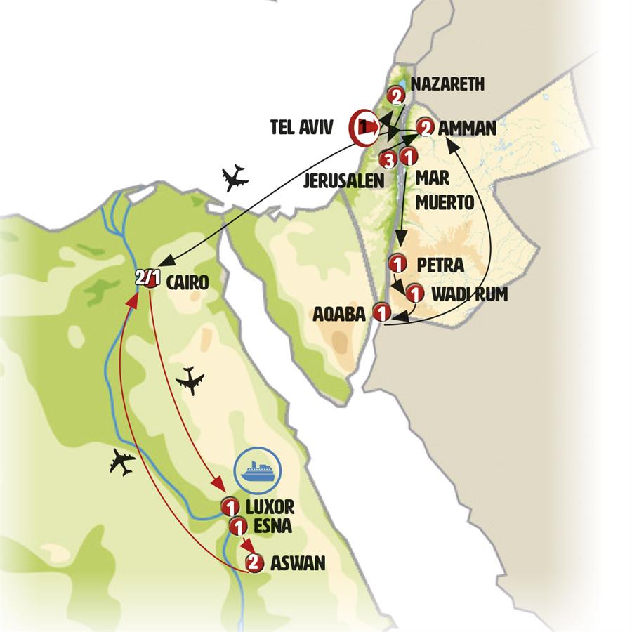 Disfruta de un recorrido grupal en autobús con guía en español durante 15 días, visitando 21 ciudades. Incluye alojamiento en hoteles y desayunos diarios. Turismo guiado por TEL AVIV, CESAREA, HAIFA, SAN JUAN DE ACRE, NAZARET, MONTE DEL PRECIPICIO, CANÁ DE GALILEA, RÍO JORDÁN, DESIERTO DE JUDEA, JERUSALÉN, PUENTE SHEIK HUSSEIN, JERASH, AMÁN, MADABA, BETANIA, MAR MUERTO, SHOBAK, PETRA, WADI RUM, ÁQABA, EL CAIRO.