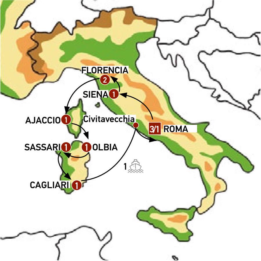 ROMA, ORVIETO, CASTIGLIONE DEL LAGO, SIENA, MONTERIGGIONI, SAN GIMIGNANO, FLORENCIA, LIVORNO, BASTIA, CORTE, AJACCIO, BONIFACIO, PALAU, LA MADDALENA, SASSARI, ALGUER, BOSA, CAGLIARI, NURAGHE LOSA, OLBIA, FERRI CAGLIARI - CIVITAVECCHIA