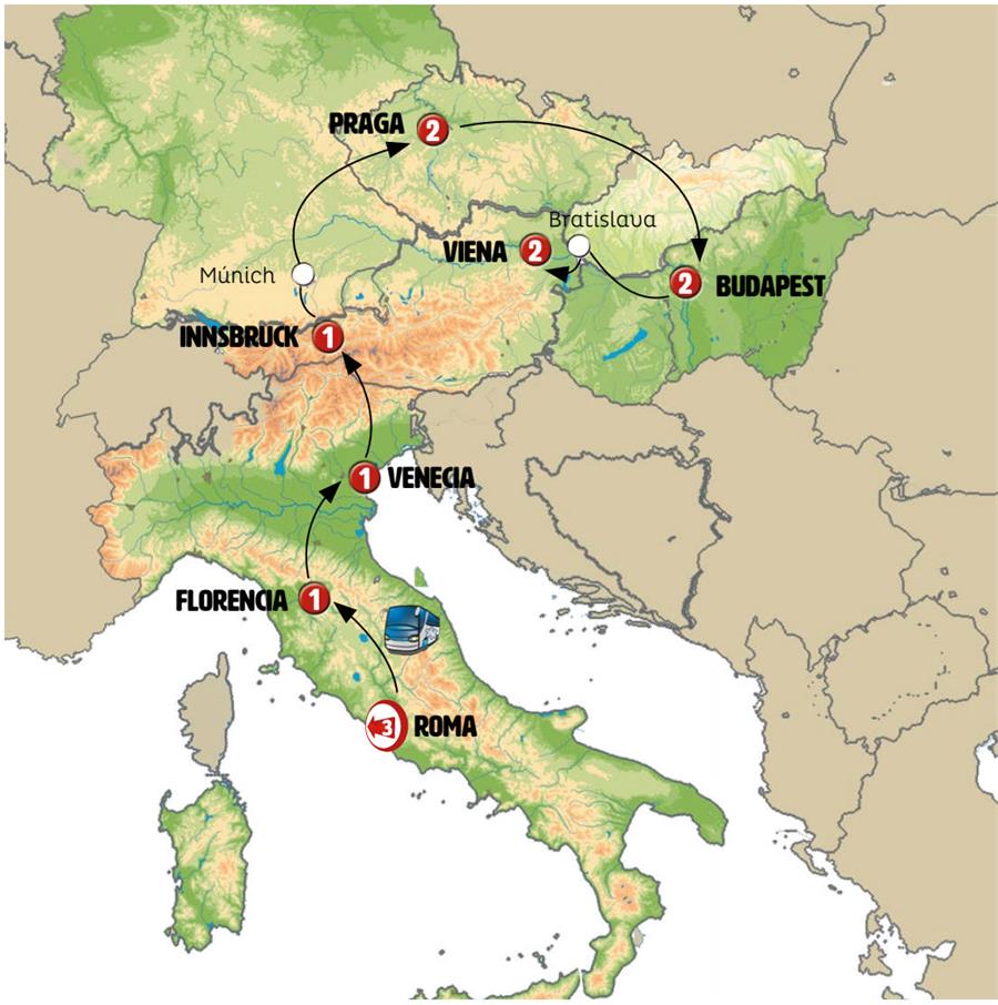 ROMA, FLORENCIA, VENECIA, VERONA, LAGO DE GARADA, INNSBRUCK, MÚNICH, RATISBONA, PRAGA, LEDNICE, GYOR, BUDAPEST, BRATISLAVA, VIENA
