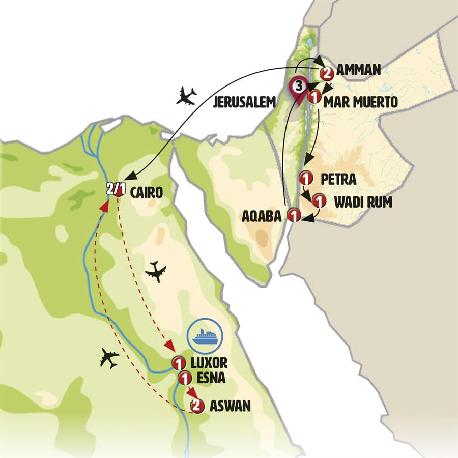 Disfruta de un recorrido grupal en autobús con guía en español durante 12 días, visitando 12 ciudades. Incluye alojamiento en hoteles y desayunos diarios. Turismo guiado por JERUSALÉN, PUENTE SHEIK HUSSEIN, JERASH, AMÁN, MADABA, BETANIA, MAR MUERTO, SHOBAK, PETRA, WADI RUM, ÁQABA, EL CAIRO.