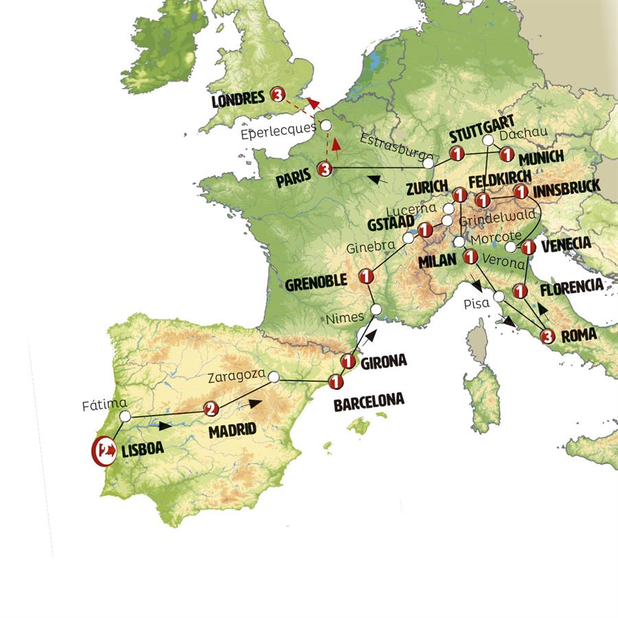Disfruta de un recorrido grupal en autobús con guía en español durante 23 días, visitando 37 ciudades. Incluye alojamiento en hoteles y desayunos diarios. Turismo guiado por LISBOA, CÁCERES, MADRID, ZARAGOZA, POBLET, BARCELONA, GERONA, CARRIÈRES DE LUMIÈRES, CHAMBERY, GINEBRA, GRUYERES, LEYSIN, INTERLAKEN, LUCERNA, ZÚRICH, BELLINZONA, COMO, MILÁN, GÉNOVA, PISA, FLORENCIA, ROMA, BOLONIA, FERRARA, VENECIA, VERONA, LAGO DE GARADA, INNSBRUCK, ZUGSPITZE, FELDKIRCH, LAGO DE CONSTANZA, LINDAU, MÚNICH, STUTTGART, HEIDELBERG, ESTRASBURGO, PARÍS.