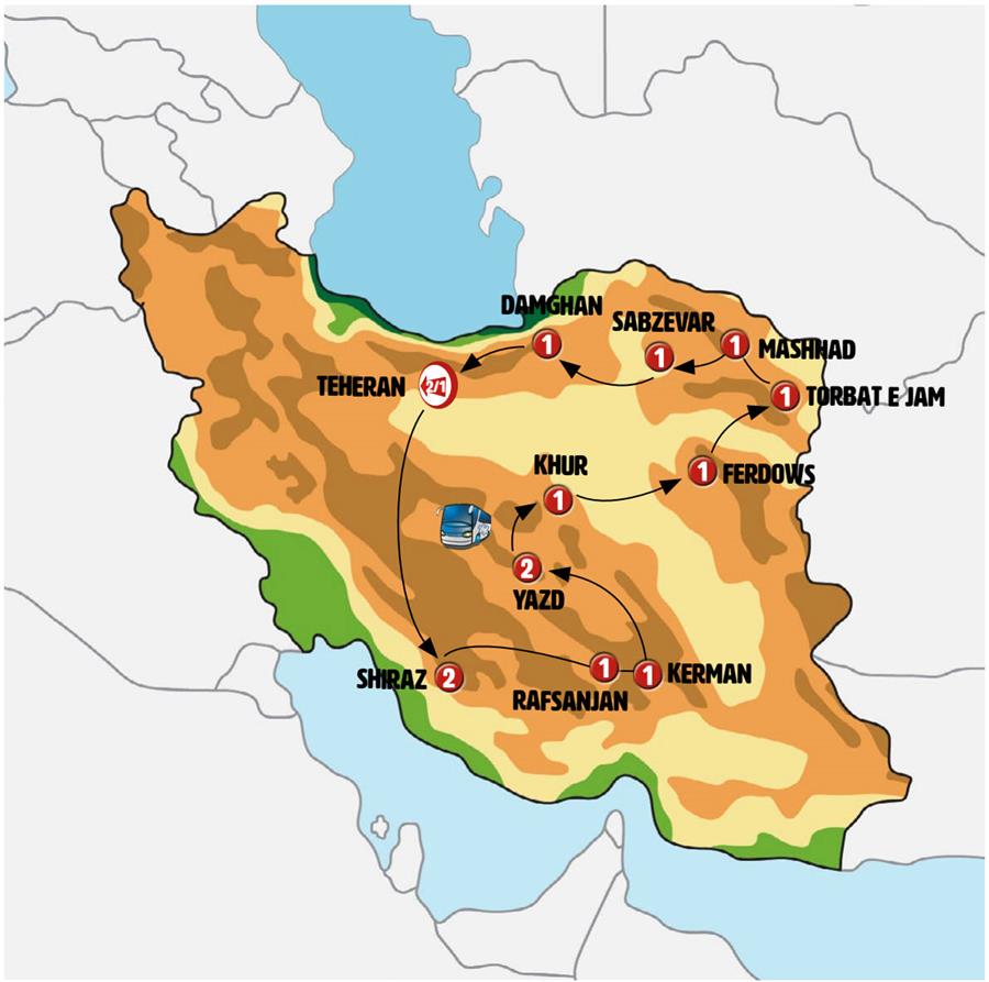 Disfruta de un recorrido grupal en autobús con guía en español durante 16 días, visitando 26 ciudades. Incluye alojamiento en hoteles y desayunos diarios. Turismo guiado por TEHERÁN, SHIRAZ, PASARGADA, MEYMAND, RAFSANJAN, MAHAN, KERMÁN, ZEIN-O-DIN CARAVANSERAI, SARYAZD, YAZD, CHAK CHAK, KHARANG, GARMEH, KHUR, TABAS, ESFAHAK, FERDOWS, GONABAD, TORBAT-E JAM, MASHHAD, NISHAPUR, ZAFARANIYEH, SABZEVAR, JANGALE ABR, DAMGHAN, GARMSAR.