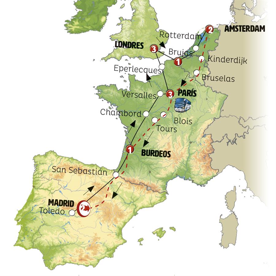 Disfruta de un recorrido grupal en autobús con guía en español durante 13 días, visitando 13 ciudades. Incluye alojamiento en hoteles y desayunos diarios. Turismo guiado por MADRID, SAN SEBASTIÁN, BURDEOS, CHAMBORD, PARÍS, CANTERBURY, LONDRES, CANAL DE LA MANCHA, BRUJAS, GANTE, MIDDELBURG, ROTTERDAM, ÁMSTERDAM.