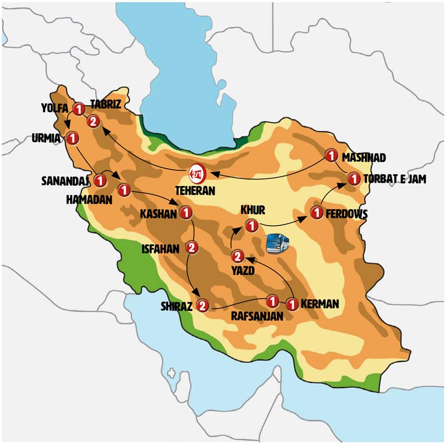 Disfruta de un recorrido grupal en autobús con guía en español durante 22 días, visitando 36 ciudades. Incluye alojamiento en hoteles y desayunos diarios. Turismo guiado por TEHERÁN, TABRIZ, YOLFA, KHOY, URMIA, TEPPE HASANLU, CUEVA SHAOLAN, SANANDAJ, HAMADÁN, QOM, KASHAN, CIUDAD SUBTERRÁNEA DE NUSHABAD, CARAVANASERAIL ABOUZEID, ABYANEH, ISFAHÁN, IZADKHAST, QALAT, SHIRAZ, PASARGADA, MEYMAND, RAFSANJAN, MAHAN, KERMÁN, ZEIN-O-DIN CARAVANSERAI, SARYAZD, YAZD, CHAK CHAK, KHARANG, GARMEH, KHUR, TABAS, ESFAHAK, FERDOWS, GONABAD, TORBAT-E JAM, MASHHAD.