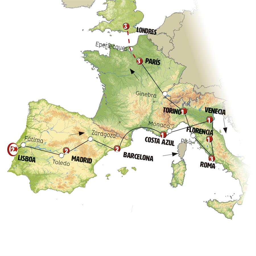 LISBOA, CÁCERES, MADRID, ZARAGOZA, POBLET, BARCELONA, COSTA AZUL, MÓNACO, GÉNOVA, VENECIA, FLORENCIA, ROMA, PISA, TURÍN, GINEBRA, PARÍS