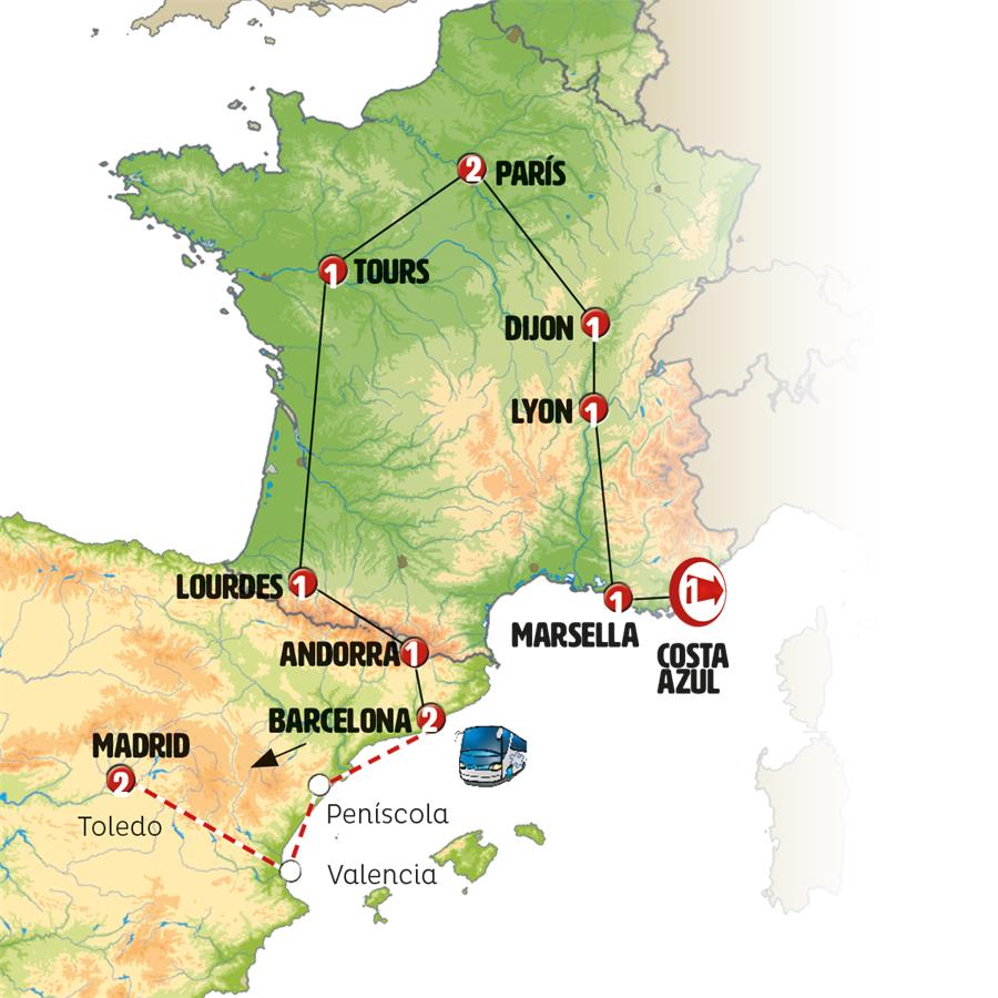 COSTA AZUL, SAINTE-MAXIME, SAINT-TROPEZ, MARSELLA, ARLES, AVIGNON, LYON, TOURNUS, CASTILLO DE SAVIGNY, BEAUNE, DIJON, ABADÍA DE FONTENAY, SEMUR-EN-AUXOIS, VEZELAY, PARÍS, TOURS, BURDEOS, LOURDES, CARCASONA, FOIX, ANDORRA, MONTSERRAT, BARCELONA, PEÑÍSCOLA, VALENCIA, MADRID