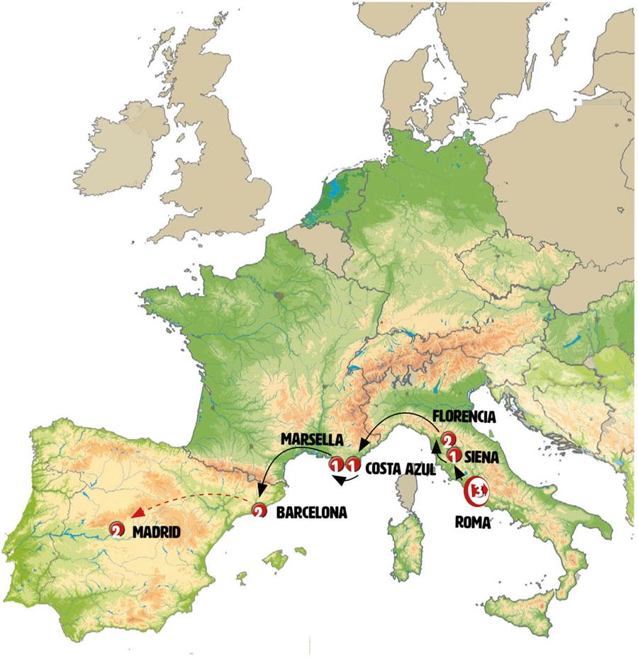 Disfruta de un recorrido grupal en autobús con guía en español durante 13 días, visitando 21 ciudades. Incluye alojamiento en hoteles y desayunos diarios. Turismo guiado por ROMA, ORVIETO, CASTIGLIONE DEL LAGO, SIENA, MONTERIGGIONI, SAN GIMIGNANO, FLORENCIA, PISA, SESTRI LEVANTE, MONTECARLO, COSTA AZUL, SAINTE-MAXIME, SAINT-TROPEZ, MARSELLA, AIX-EN-PROVENCE, AVIGNON, PUENTE DE GARD, BARCELONA, PEÑÍSCOLA, VALENCIA, MADRID.