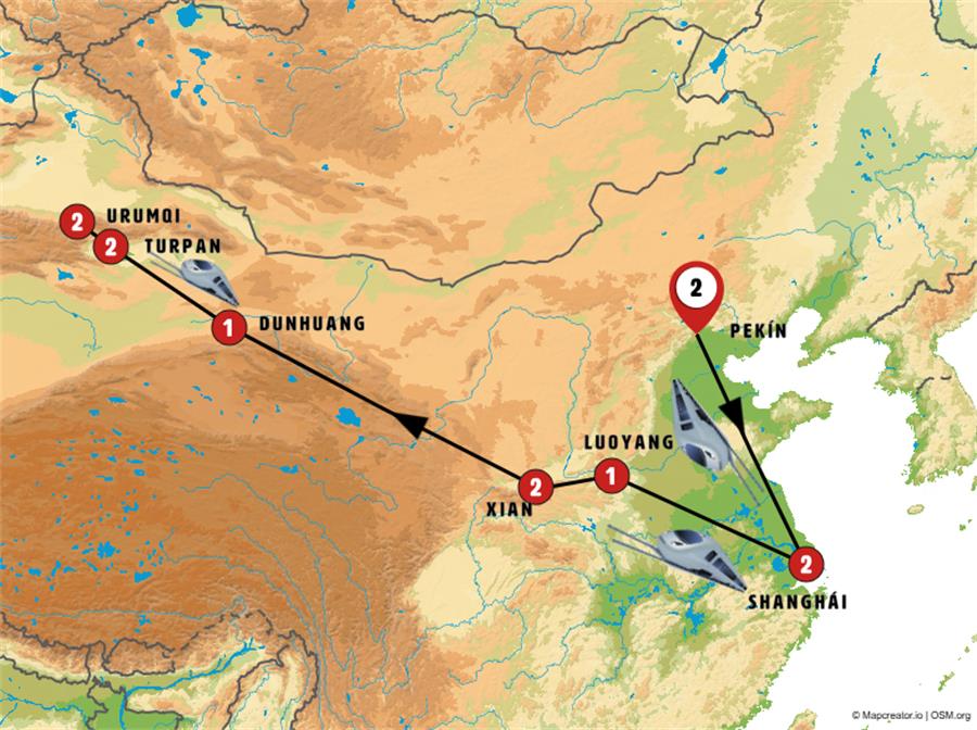 Disfruta de un recorrido grupal en autobús con guía en español durante 13 días, visitando 9 ciudades. Incluye alojamiento en hoteles y desayunos diarios. Turismo guiado por PEKÍN, SHANGHÁI, LUOYANG, LONGMEN, SANMENXIA, XIAN, DUNHUANG, TURPAN, URUMQI.